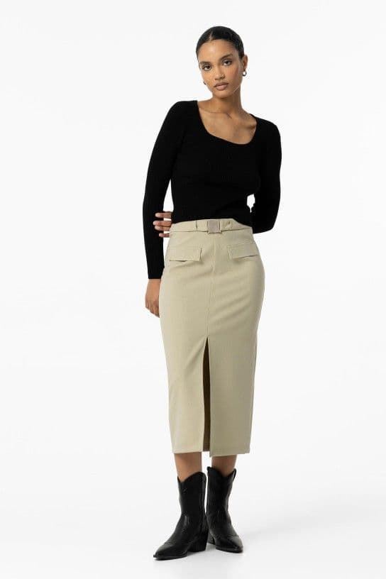 Falda midi de tiro alto con abertura frontal y cinturón con hebilla dorada. Cierre lateral con cremallera oculta en costura. Bolsillos falsos delanteros.